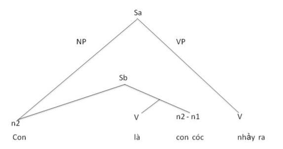 Câu Sb đã được cài vào trong nội bộ của câu Sa để trở thành: Con (con là con cóc) nhảy ra, theo mô thức n2 (n2 là (n2 – n1)) – VP. Biểu đồ cây (tree diagram) dưới đây càng làm sáng tỏ mối liên hệ này: