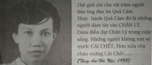 “Là phụ nữ duy nhất, không viết bài cho NVGP, nhưng tên bà bị nêu lên hàng đầu trong ‘hàng ngũ phản động’, bà bị quy kết là ‘gián điệp quốc tế’, lãnh án 15 năm tù cùng với Nguyễn Hữu Đang…”