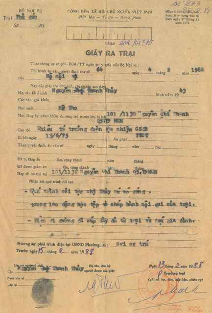 Bà kể, “Tôi thắng được cơn sốt rết liệt giường. Tôi thoát được bị phản ứng Penicilline, cố luyện tập để tránh bị liệt chân, thoát khỏi cơn xuất huyết bao tử để trở về được với gia đình, con cái. Nghị lực tôi có được là do niềm hãnh diện tôi phục vụ cho đất nước tự do, chống lại độc tài, áp bức, tàn ác của Cộng Sản. Dù bị bọn Cộng Sản lên án, tôi vẫn cho việc làm trước 1975 là đúng. Tôi vui mà sống. Các cộng sự với tôi đã lần lượt ra về không trở ngại. Còn lại một mình, tôi mới hy vọng đến lượt mình. Thời gian thắm thoát trôi. Lúc cầm tấm giấy tha ra khỏi trại tù cải tạo 230D, hàm răng trên tôi không còn, hàm răng dưới lỏm chỏm cái có cái không. Mặc cái áo tù sửa lại cho vừa vặn với thân hình ốm còi, tôi không còn một bạn gái nào tập trung cải tạo như tôi vì tôi là người tù nữ cuối cùng của tù tập trung cải tạo. Tôi buồn khi nhìn lại một số bạn tù nam không có tên gọi trong đợt này. Tôi vẫy tay từ giã tạm biệt, hẹn ngày hội ngộ ngoài xã hội. Về đến Quận II, tôi bị phỏng vấn, giấy tờ còn nộp trên bàn để làm thủ tục về phường tỉnh mình cư ngụ. Nhà báo hỏi tôi, ‘Có phải Mỹ can thiệp nên chị mới được ra?’ Tôi trả lời, ‘Ở trại, tôi có được nghe tin tức hay đọc báo gì đâu. Hôm nay có lệnh gọi tha về thì tôi nhận giấy về.’ Thật sự giấy tờ còn ở trong tay bọn họ. Nói đúng với ý mình, họ không đưa giấy ra trại lại thì sao? Ở tù nhiều năm, tôi chưa hình dung cái xã hội của Chủ nghĩa Xã hội nó như thế nào. Cầm cái nón lá trong tay, tôi ra sau cùng vì nghĩ nhà cửa bị tịch thu hết, công an phường biết đâu mà thông báo vì cả nhà hồi hương về Mỹ Tho, trong lòng định đi bộ về nhà Dì ở gần chợ Sàigòn. Đang đi nghe tiếng gọi tên mình, ngó lên thấy vợ chồng đứa em trai đang chạy tới, mừng rỡ cùng nhau đi bộ về nhà Dì.”