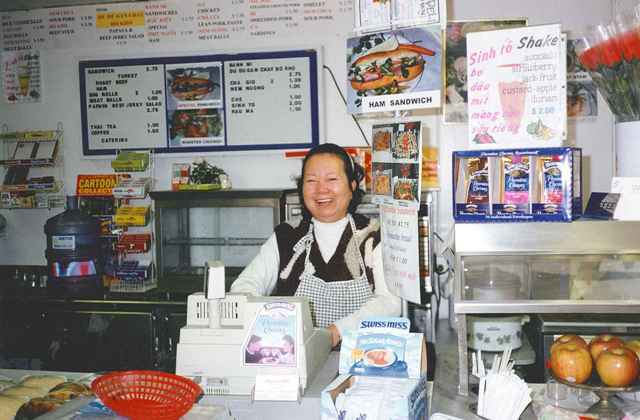 Bà cười rạng rỡ, nói một mạch, “Tôi đi làm công cho Phở Cali được gần ba năm, phải khiêng những thùng chè lạnh cất trên cao trong tủ lạnh. Dần dần, tôi bị đau khớp xương lưng. Sau lần đó, tôi xin nghỉ việc. Với số tiền dành dụm, tôi chỉ có thể sang một cửa tiệm nhỏ để bán fast food. Tôi biết nghề buôn bán rất cực nhưng tôi muốn tự làm chủ lấy, làm vừa với sức mình, lợi nhuận khá hơn đi làm công, lại có nơi gặp gỡ bạn tù. Tôi cũng thích nghề nấu ăn. Ở Việt Nam, tôi cũng học nhiều lớp về bánh, nấu ăn cho vui khi làm việc cho chính quyền Sàigòn, cũng như sau khi đã ra tù cải tạo. Không ngờ đây là lúc đem ra sử dụng. Tôi tin là tôi chịu khó nhọc được và có chút căn bản về nấu nướng nên có thể sống được, trong khi bạn bè nghĩ tôi không làm nổi nghề này.