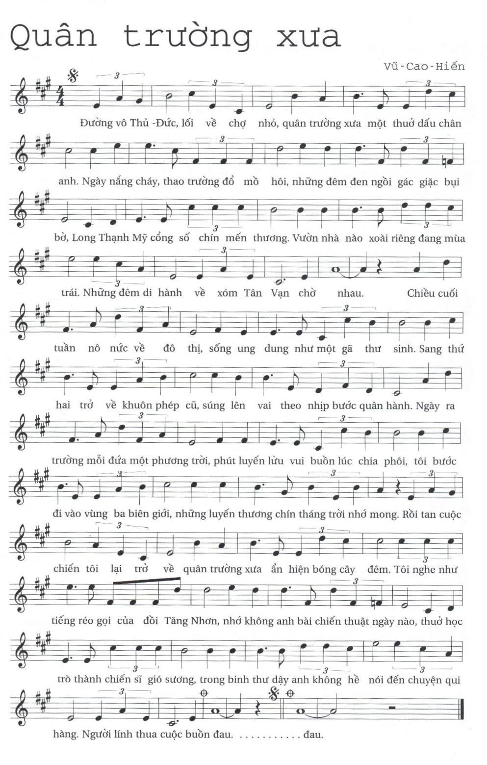 Cũng nhờ sự thu thập của anh mà tôi được nghe lại với niềm xúc cảm khó quên về nhiều bản nhạc mà anh em chúng tôi ở hai trại Nam hà và Vĩnh Phú đã nghe đi nghe lại nhiều lần, trong đó có một tù khúc của một người viết nhạc không chuyên nhưng để lại ấn tượng ray rứt, tiếc nuối cho những người một thời hiến dâng tuổi trẻ bước vào quân trường theo tiếng gọi của núi sông. Tôi muốn nhắc đến bản ’Quân Trường Xưa’ và tác giả của nó là đại úy Vũ Cao Hiến, một cựu sinh viên trường Võ Bị Quốc Gia, một người tù cải tạo tôi đã có dịp chung phòng chung trại, nhưng nay thì cả người lẫn tên đã trở thành ‘tượng đài thuyền nhân trên biển’ trong một chuyến vượt biên tìm tự do sau khi anh xuất trại vào giữa thập niên ’80.