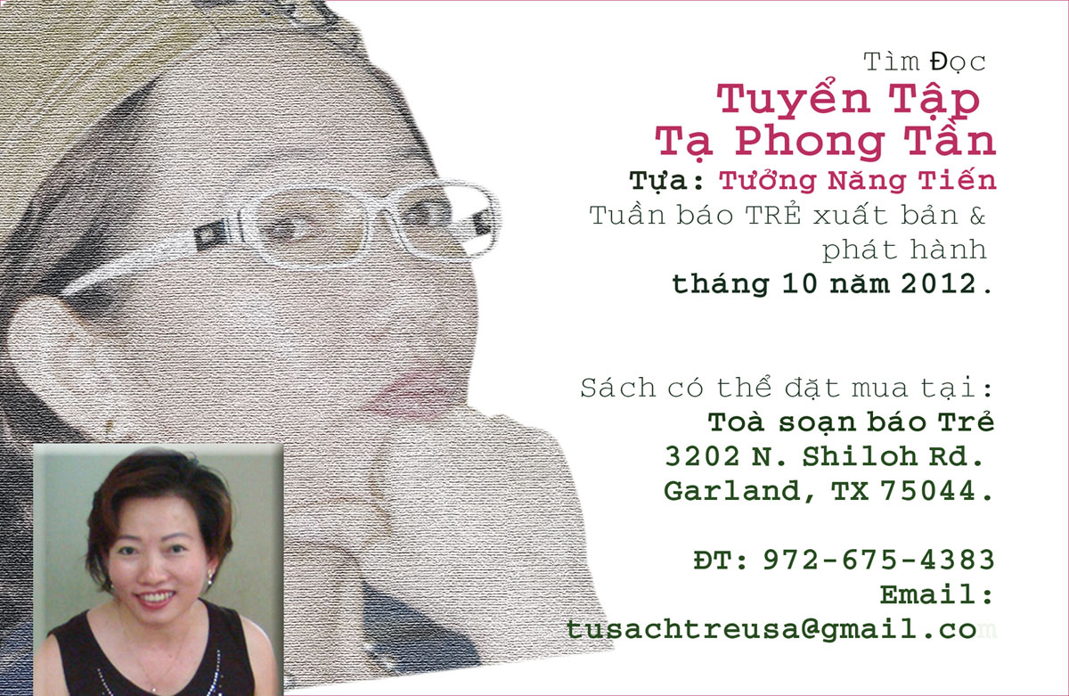 Thể theo ý nguyện này, tôi đã liên lạc và được ban biên tập tuần báo Trẻ đồng ý phụ trách xuất bản Tuyển Tập Tạ Phong Tần (*). Đây là một cuốn sách mỏng chỉ bao gồm một số những bài viết về thời sự của tác giả trong hai năm 2010 và 2011 nhưng thể hiện được đầy đủ những nỗ lực – cũng như quan niệm – của em tôi về vai trò của một blogger: “Dùng quyền công dân của mình đòi hỏi công chức Nhà nước phải thực hiện đúng chức năng, nhiệm vụ, quyền hạn mà luật pháp quy định.”