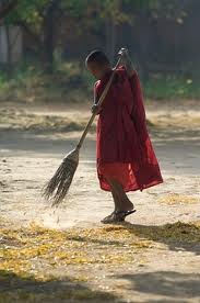 Nhà Sư huơ chổi quét. Thỉnh thoảng dừng tay, cười: “Trăm năm một kiếp người, một năm một kiếp lá. Xanh tươi và tàn tạ, bắt đầu – kết thúc, thôi!”