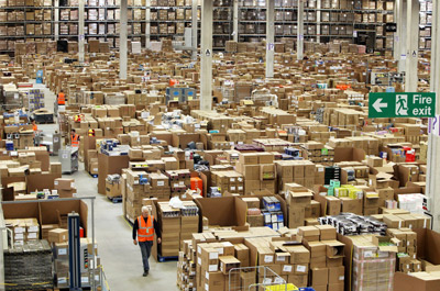 Cảnh bên trong một trong những nhà kho của Amazon trên khắp thế giới, nơi gửi hàng đến khách hàng mua sắm từ trang mạng của công ty. (Hình: Matt Cardy/Getty Images)
