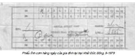 Trưa 03-9-1979, nhà thầu đưa cơm hộp đến, từng hộ gia đình đem phiếu cơm ra nhận phần, mỗi người một suất không kể lớn bé già trẻ trai gái, món ăn lại có 5 món khác nhau. Mấy xe tải có nữ nhân viên phục vụ mặc áo đồng phục, sạch sẽ, nét mặt tươi cười, đon đả, tử tế yêu cầu mọi người xếp hàng trước xe rồi thông báo có 5 loại món ăn, tùy ý lựa chọn.