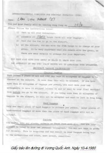 Cả đêm 12 gia đình chúng tôi thao thức, hết đi ra lại đi vào, hết ngồi lại đứng, mong trời mau sáng. Chúng tôi được giấy báo sáng sớm 10-4 lên máy bay đi Anh Quốc tuy có ghi giờ xe đón 6.00 am, nhưng chẳng ai ngủ được vì quá sung sướng, tràn trề hy vọng. Những ngày đầu đường, xó chợ, vật vạ từ bến Tam Bạc, Hải Phòng, Bắc Hải, Kho Đen… chấm hết.