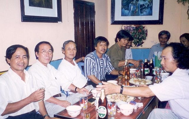 Từ trái : Võ Quê – Đinh Cường – Định Giang và bạn bè ở Huế 1999