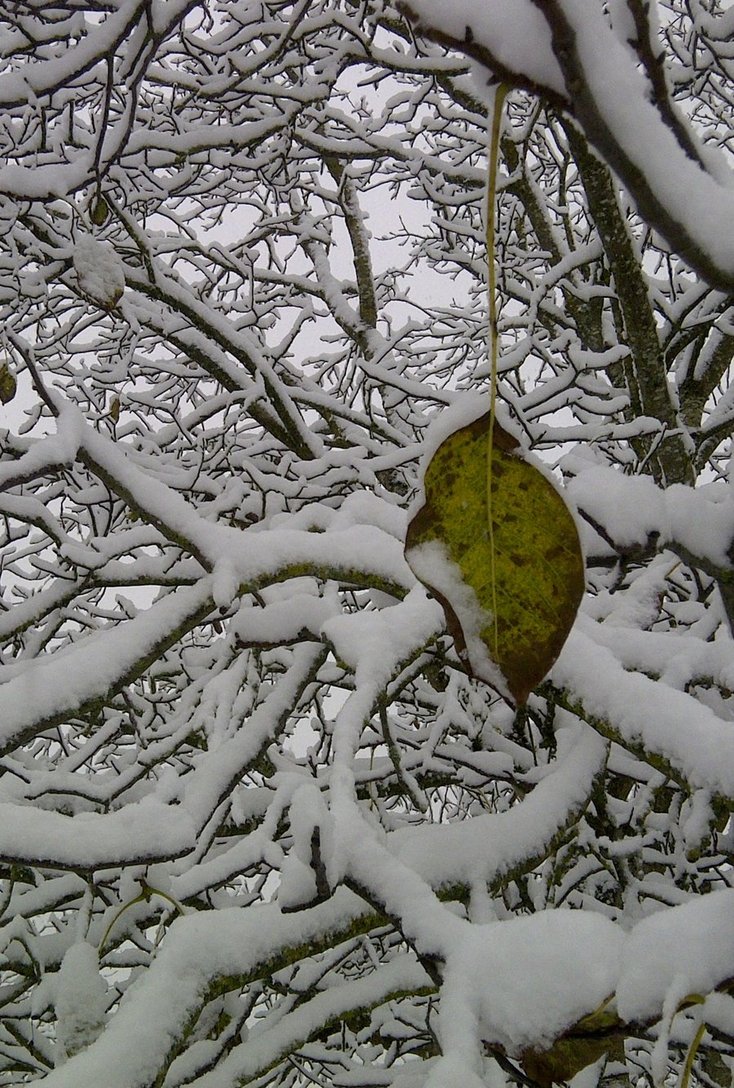 nhìn chiếc lá xanh treo giữa trời tuyết đổ