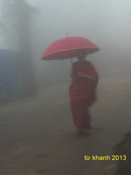 Upper Dharamsala không ngày nào không mưa, không ngày nào không mây trời tràn khắp những con đèo quặn thắt tróc lở. Mùa mưa thì trời mưa. Tôi đến vùng Thượng Dharamlasa cuối tháng 8. Mưa đón chào một trận ở bến xe. Lên đèo và xuống đèo lội nước đến nhà trọ. Những dòng nước trắng bong vô kỷ luật trào từ sườn núi rào rạt tiếng gọi lung tung.