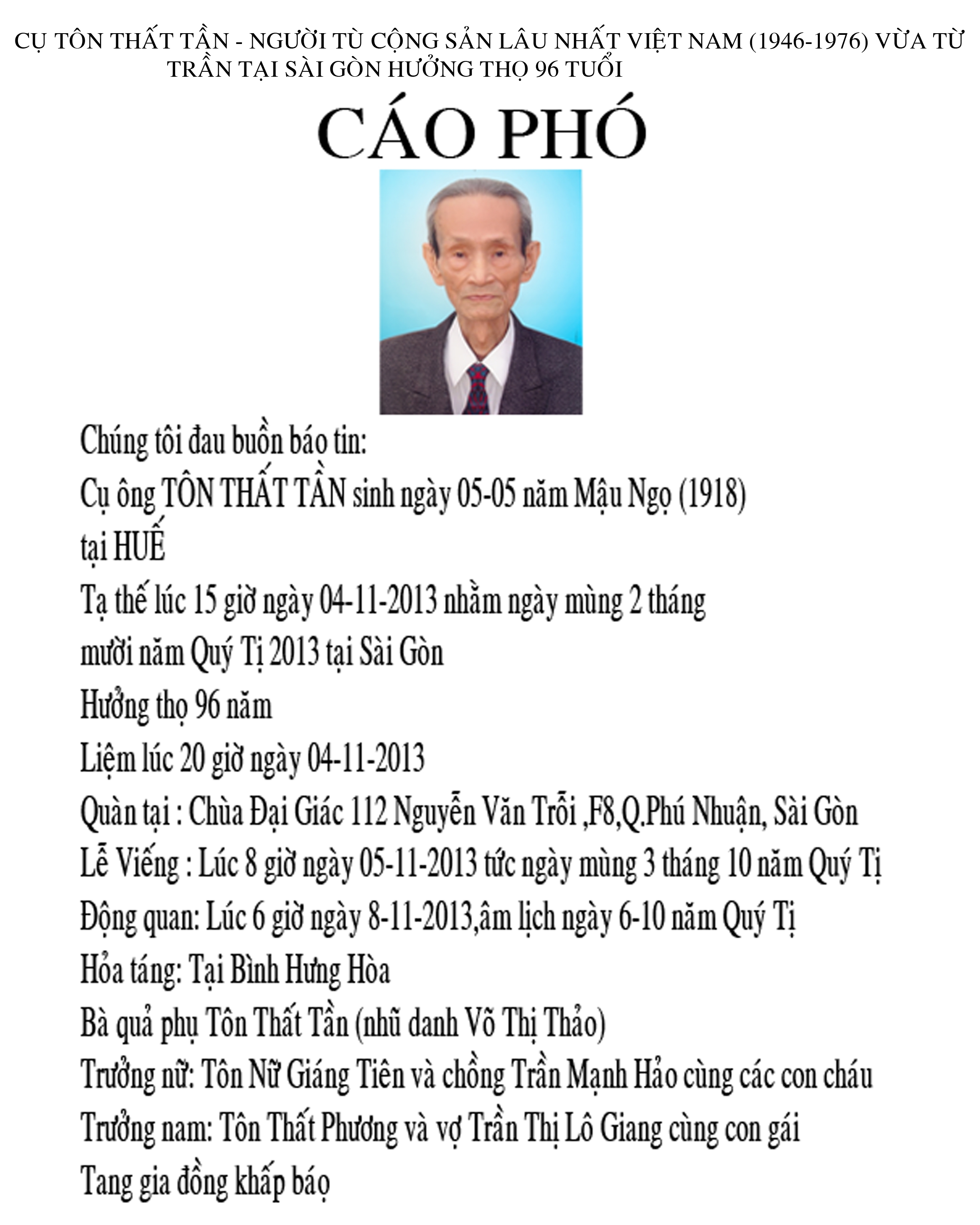 Cuộc đời người tù của cụ Tôn Thất Tần kéo dài qua đời ba đảng Mác xít: Đảng Cộng sản Đông Dương, đảng Lao động Việt Nam, đảng Cộng sản Việt Nam. 96 năm có mặt trên cõi đời thì một phần ba cuộc đời cụ Tôn Thất Tần, 32 năm (1946 – 1977), để lại trong nhà tù Cộng sản.