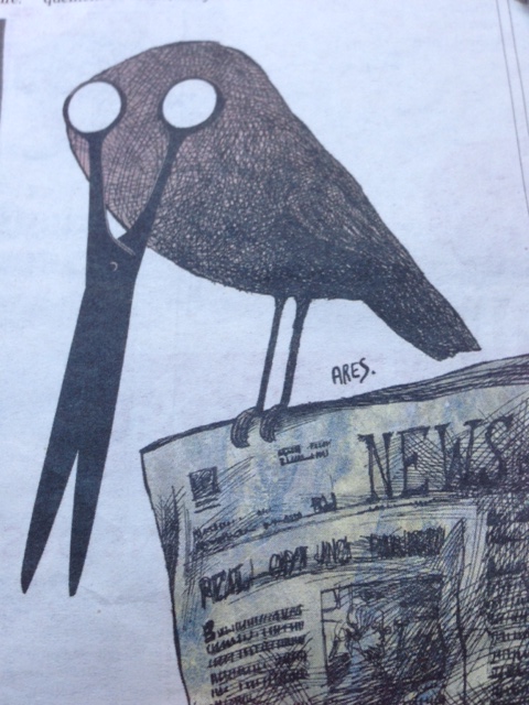 Thời bé, nghe Mạ tôi hay nói: Cú dòm nhà bệnh! Nghe mà không đòi giải thích, tự hiểu đó là cụm chữ chẳng tốt lành dành cho hạng người có tâm địa ám muội, bất chính. Bây giờ đã lớn tuổi, xem tranh biếm hoạ này cũng ngầm hiểu lấy mà không đưa ra lời bình phẩm. Chỉ biết nó “ấn tượng”, nó “hơi bị choáng”. Nét vẽ chuyên nghiệp, chẳng hề do một tay mơ “ngoại đạo” dựng nên hình khối. Con chim đen ấy là quạ (?) chứ không là cú, cái mõ được cách điệu dài nhọn tựa loài kên kên. Thay vì gục đầu rỉa rói trên thi thể rách bươm của con mồi xấu số, nó đậu xuống trang báo và cái mõ lập tức biến dạng thành hình thù một cây kéo. Chú ý tới dụng tâm của hoạ sĩ: hai tròng mắt con quạ trắng dã. Một sự vô cảm? Một con số không? Một sự mù loà? Hay một đầu óc đã bị tẩy não? Tớ sẽ cắt xẻo cho tới hồi nào nó sạch trắng mặt chữ, đằng ấy liệu thần hồn, phải co quắp lại, chớ ngu ngoe.