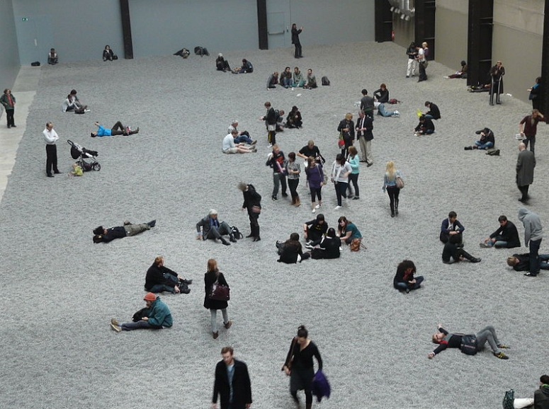 Sân chơi cho người thưởng ngoạn tham dự vào tác phẩm. Hạt Sun Flower trải làm nền.