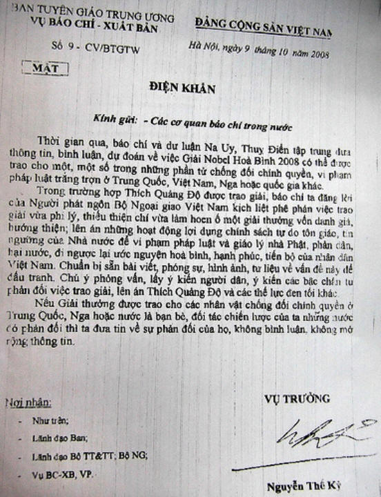 Công điện chỉ đạo đối phó với tình huống Hòa thượng Thích Quảng Độ được trao giải Nobel Hòa bình do ông Nguyễn Thế Kỷ ký ngày 9 tháng 10 năm 2008. Ảnh và chú thich: RFA