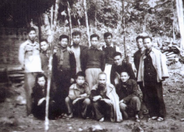 Ở văn phòng mới dọn đến của Tổng bí thư mùa thu 1949. Hàng đầu toàn ngồi xổm, từ trái qua, vợ Hà Xuân Trường, Lê Ðạt, Hồ Chí Minh. Ngoài cùng bên phải là Trường Chinh, áo blu dông Mỹ trắng. Hàng sau đứng đầu bên trái là Hà Xuân Trường, thư ký tòa soạn báo – (hình do tác giả Trần Đĩnh cung cấp)