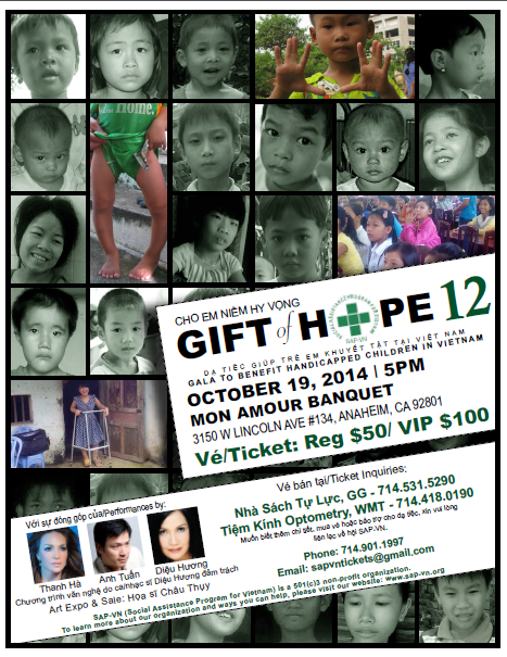 Những tấm lòng của SAP-VN sẽ luôn mãi trẻ, dù ở tuổi nào, vì Tình Thương thì không biết đến tuổi tác, màu da, giai cấp. Một Tình Thương Tâm Việt, sẽ được diễn đạt qua bút hoạ Châu Thuỵ và những “trái tim rất chín muồi” của SAP-VN tại buổi tiệc gây quỹ “Cho Em Niềm Hy Vọng 12” vào lúc 5 giờ chiều, ngày 19 tháng Mười 2014. Như mọi năm, dạ tiệc sẽ diễn ra tại Nhà hàng Mon Amour, tọa lạc tại 3150 W. Lincoln Ave, #134, Anaheim, CA 92801. Đặc biệt năm nay, chương trình văn nghệ sẽ do ca nhạc sĩ Diệu Hương phụ trách, với sự xuất hiện của ca sĩ Thanh Hà và Anh Tuấn.