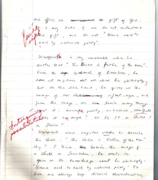 Với một lòng tha thiết đến các bạn trẻ hôm nay, tôi xin được post những trang giấy của chính tôi – một học trò già. Sự thành công của kỳ thi Final về một môn học khó nuốt, nhất là đối với một sinh viên ngành điện toán, không phải là văn phạm vững, là những từ dùng đúng hay những nguyên tắc cho một bài bình luận văn học (tham khảo, nguồn, trang, tác giả) bởi vì đây là bài thi final trong một phòng thi rất trống trải được kiểm soát gay gắt. Bạn thấy vài câu ông sửa lại lỗi văn phạm. Bạn thấy chữ viết tôi thì quá xấu đọc đến muốn nổ con mắt (vì sợi gân ngón tay viết của tôi bị đứt bởi miểng lựu đạn) hay có giòng tôi xóa bỏ tùm lum. Vậy mà ông giáo sư lại cho hạng A. Đó là điều khó tin cho một sinh viên già tị nạn. Sự thành công, tôi nghĩ, chính là nhờ ở sự tôn trọng của vị giáo sư về ý tưởng và lý luận của người học trò. Mặc dù cái nhìn của ông khác với cái nhìn của tôi. Như lời phê You are right của ông: