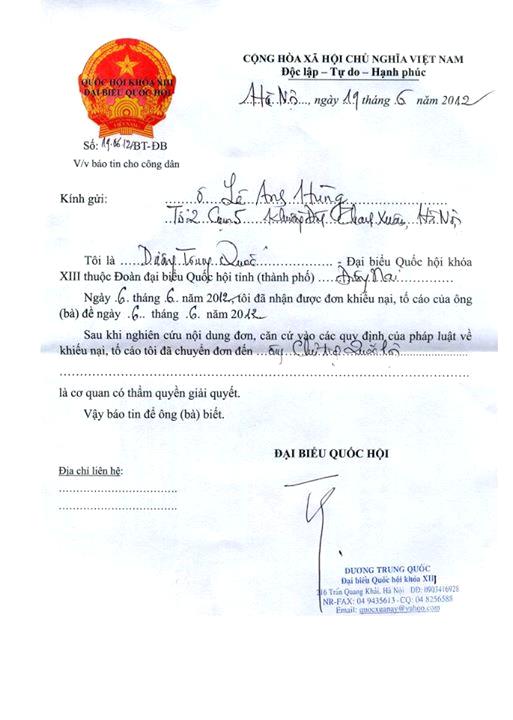 Nội dung và hình thức của lá thư “báo tin” này khiến người ta có cảm tưởng như là nó đã được gửi từ một cái bưu trạm – nơi một huyện lỵ xa xôi hẻo lánh nào đó – bởi một anh bưu tá, chứ không phải từ văn phòng của một vị Đại Biểu Quốc Hội (“năng nổ”) cỡ như ông Dương Trung Quốc.