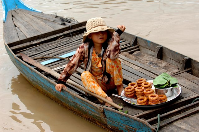 Một hình ảnh khác xoáy vào tâm tư tôi, là hình ảnh cô bé bán bánh rán gói lá lục bình trên một con thuyền. Cô bé ấy mong manh như một chiếc lá lục bình, ngỡ ngàng giữa cảnh đìu hiu của một ngày chợ thưa, không cười không nói. Những cái bánh rán vàng ươm mật đường thốt nốt ấy, xem chừng hớn hở hơn cả cô bé bán hàng bất đắc dĩ kia. Tôi chợt nhớ câu thơ trong bài “Sở Kiến Hành” của đại thi hào Nguyễn Du, “Trông mặt trời vàng úa.” Trên thuyền, là một mặt trời chưa rạng ban mai mà đã úa vàng. Tôi xót xa khi nghĩ rằng, có thể chính mình cũng ở trong thế giới mâm cao cỗ đầy của Trạm Tây Hà, khi cô bé bán bánh rán kia vẫn lưu lạc trong trời đêm lạnh cóng của Sở Kiến Hành. Tôi có xứng đáng chưa với những gì mình nhận được trong cuộc đời này? Và liệu tôi có dám làm người vô can khi chứng kiến cảnh sống nhục nhằn đứt khúc của tuổi thơ Việt Nam bên vệ đường thế giới?