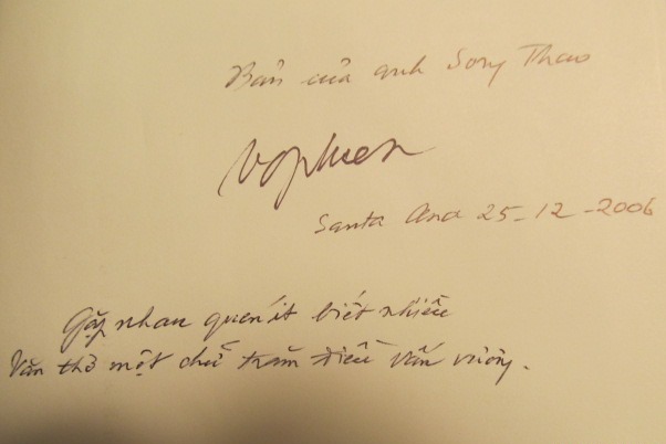 Sách bìa cứng, trình bày rất trang nhã trên nền là hình bầu trời xanh nhạt với những đám mây trắng lững thững trôi. Nhà văn Võ Phiến rất trân trọng công sức của các văn hữu đã hoàn thành cho ông một cuốn sách để đời. Tôi mở sách ngó lướt qua. Mắt rất thư thái với lối trình bày giản dị, sáng sủa, được in trên giấy nền vàng nhạt dịu dàng. Ông cầm lại cuốn sách, chỉ cho tôi trang đầu. Tôi chôn mắt đọc. “Bản của anh Song Thao, Santa Ana 25-12-2006”. Dưới dòng đề tặng là hai câu thơ: