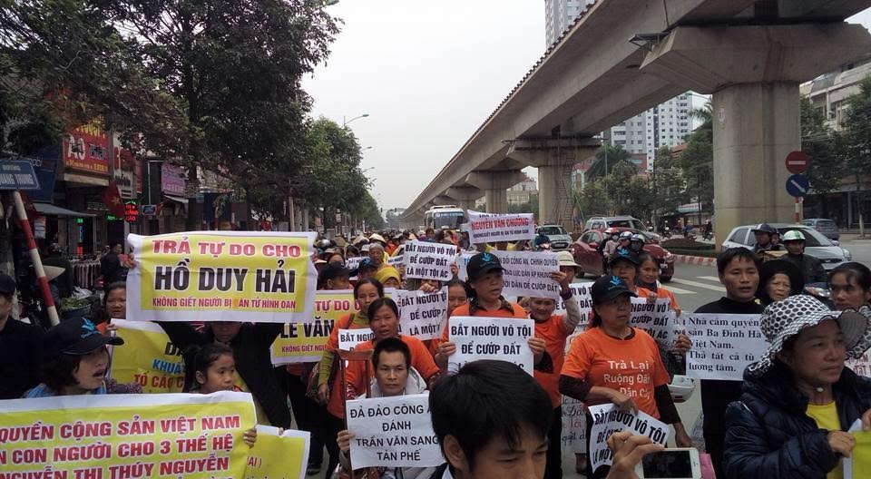 Ngoài anh Trần Văn Sang, rất nhiều người đã tham dự biểu tình để lên tiếng về những tai họa cho chính họ và gia đình họ do chế độ Cộng Sản gây ra. Trong cuộc tuần hành hình ảnh một em bé gái nổi bật với tấm áo đỏ viết hàng chữ tự giới thiệu: “Cháu Ðoàn Trương Anh Thư” với câu “Tuổi thơ của con bị bọn tham nhũng cướp mất!” Ðông đảo và bền chí nhất chắc là gia đình bà người bị tuyên án tử hình sau những phiên tòa xử không đúng luật. Họ mang các biểu ngữ đòi “Trả tự do cho tử tù Nguyễn Văn Chưởng, Lê Văn Mạnh, Hồ Duy Hải.” Những vụ “án oan” này đã sôi nổi trong dư luận suốt nhiều năm nhưng chế độ tư pháp của đảng Cộng Sản vẫn chưa nhận tội! Các hình ảnh được đưa ra nhiều lần cho thấy những nét đăm chiêu nhưng cương quyết của gia đình các nạn nhân. Trước các khuôn mặt buồn rầu của những người mẹ già, những bà vợ và các đứa con là các tấm bảng viết “Trả tự do con tôi!” “Trả tự do bố tôi!” “Trả tự do em tôi! Vân vân.