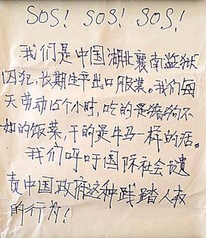 “SOS! SOS! SOS!… We are prisoners in the Xiang Nan Prison of the Hubei Province in China. Our job inside the prison is to produce fashion clothes for export. We work 15 hours per day and the food we eat wouldn’t even be given to dogs or pigs. We work as hard as oxen in the field.”