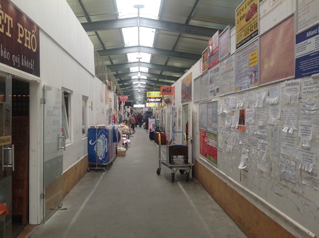 Miên man suy nghĩ, cô bạn nhắc : « Mình xuống anh chị ». Nếu không có cái bảng to đùng đón chào khách thì chắc mọi người không biết đây là khu chợ xầm uất của người Việt. Từ ngoài đường Herzberg, có thể thấy những ô cửa kiếng bị vỡ nát, những cánh cửa sổ cũ kỹ, những bức tường gạch nhuộm màu của năm tháng. Sự điêu tàn là ấn tượng ban đầu đập vào mắt. Những dấu vết của vụ hoả hoạn hồi tháng 9-2015 tại chợ Đồng Xuân vẫn còn đó.