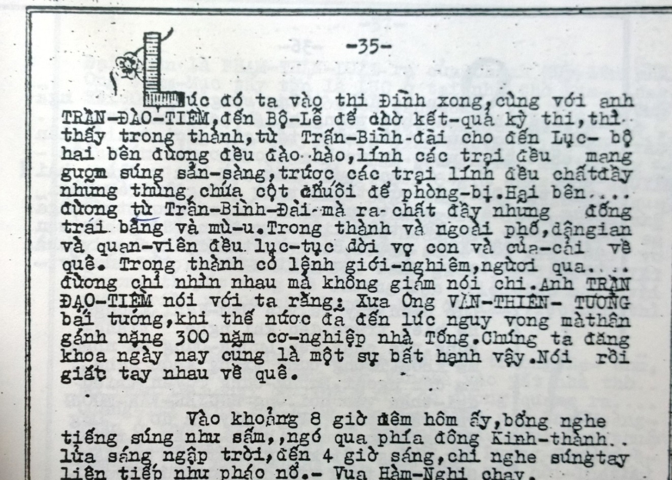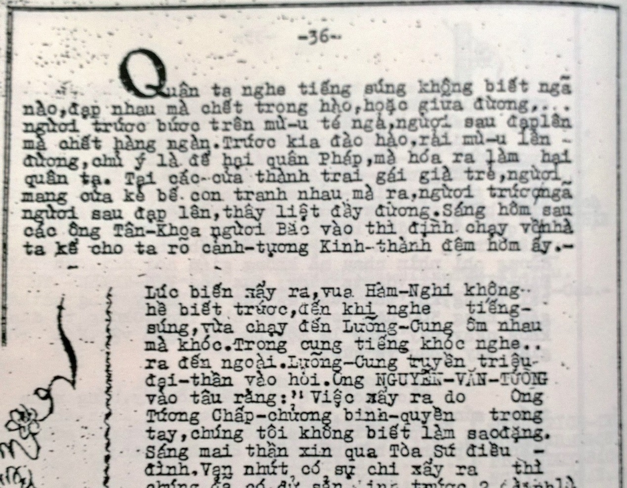 Bên dưới là hình chụp hai trang 35 và 36 liên hệ trận mù u, xẩy ra đêm 22 rạng ngày 23 tháng 5 Ất Dậu 1885, dưới thời Vua Hàm Nghi triều Nguyễn, trên con đường gần Mang Cá đến Đại Nội. Đồn Mang Cá tên chữ là Trấn Bình đài, về phía Đông Bắc cố đô, bên bờ Sông Hương, vị trí trấn giữ quan trọng từ Biển Đông vào kinh thành Huế.
