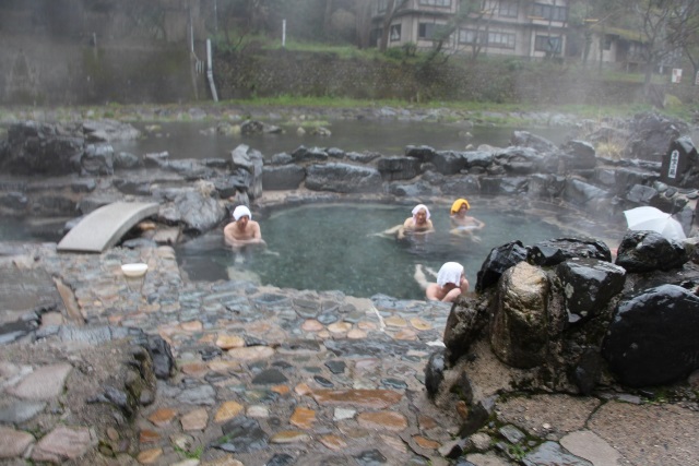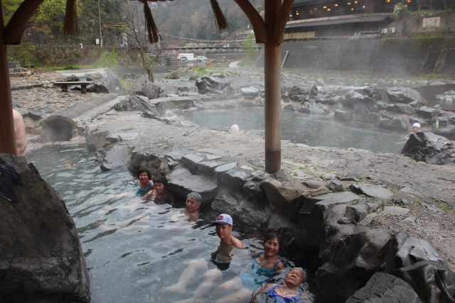 Nơi Yubara Onsen mà chúng tôi tới thì không hiểu sao vẫn nam nữ hòa đồng. Trời mưa lất phất nên suối không đông lắm, chỉ khoảng mươi…tắm sĩ đực rựa. Nhóm chúng tôi thì có cả nam lẫn nữ. Nhìn người ta tắm mà phân vân, xuống hay không xuống. Không xuống thì uổng, vượt bao nhiêu đường đất, mất cả ngày trời mới tới chẳng lẽ chỉ đứng nhìn khói nước bốc lên. Đúng lúc đó có một cặp vợ chồng già tới tắm. Ông chồng tô hô như những ông khác, chỉ có một chiếc khăn bé tí tẹo như khăn rửa mặt. Khi ở trên bờ thì che hạ bộ, xuống nước thì đội chiếc khăn trên đầu. Tuyệt đối không được thả khăn dưới nước. Thấy bà tiên khoác một chiếc áo khoác rộng xuống tắm, phe ta mới vỡ lẽ. Không có áo khoác thì mặc áo tắm.