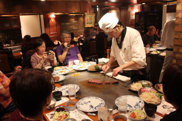 Tiệm có khoảng hơn trăm chỗ được phân bổ khá lạ. Họ chia thành từng cụm bàn, mỗi bàn có 14 chỗ. Nằm chính giữa bàn là một miếng kim loại hình trỏn khá lớn dùng làm bếp. Bếp lại được chia ra làm hai theo hình bán nguyệt, mỗi bên có 7 chỗ ngồi vây quanh. Đứng giữa hai bàn hình bán nguyệt là hai đầu bếp mặc đồng phục trắng, đội mũ cao trông rất tư cách. Mỗi người phụ trách nửa bàn gồm 7 thực khách. Trước mỗi thực khách đã được dọn sẵn một chén súp miso, một chén kim chi, một chén sà lách cà chua, một chén cơm và ba chén nước chấm. Trước hết họ xào tỏi đã được cắt thành lát lớn trông như miếng chip. Mùi thơm bốc lên. Sau đó đầu bếp gạt lớp tỏi qua một bên, lấy ra một phần thịt làm steak. Họ để nguyên miếng thịt 150 gram (thịt bò quý phái nên mỗi khẩu phần chỉ có vậy!), hỏi ý người khách muốn ăn thịt chín, trung bình hay hơi sống. Cũng giống như các nhà hàng làm steak khác. Làm chín sơ quanh miếng thịt xong, họ cắt thành từng miếng vuông vức vừa một miếng ăn, lật quanh bốn bề cho chín đều từng miếng nhỏ, gạt qua một bên. Tiếp theo là giá và hành được xào sơ. Bỏ thịt bò và tỏi vào một đĩa, hành và giá vào một đĩa khác. Vậy là xong một người. Lần lượt họ làm cho tất cả bảy người. Mời mọi người…thời!