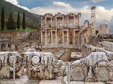 Tối hôm đó du thuyền chúng tôi vào địa phận Turkey. Sáng sớm đổ bộ lên bờ, dùng bus đi Kusadasi, một thành phố Turkey tiếp giáp Hy Lạp. Đường xá, nhà cửa phía bên nầy loang lổ, vá víu, có vẻ luộm thuộm, nghèo nàn hơn bên Hy Lạp. Núi đá khô cằn, chỉ thấy cây ô -liu được trồng rải rác trên sườn núi đầy đá sỏi không có một chút đất đen, thấy mà tội nghiệp. Loại cây nầy thân mộc to cao chừng 7, 8 thước, lá nhỏ như là trúc đào, mặt trên xanh, mặt dưới màu xám bạc, nhiều cây già cổi có dáng đẹp uốn éo như bonsai. Khu vực nầy xưa gọi là Anatolia và di tích Ephesus là thủ đô của 500 thành phố trong khu vực nầy. Vào thế kỷ thứ 5 Tr TL, người ta đã xây dựng lên một thành phố tráng lệ để thờ phụng nữ thần Artémis. Ngôi đền được mô tả làm theo kiến trúc Hy Lạp tuyệt đẹp, được liệt vào kỳ quan thế giới cổ đại. Nữ thần Artemis cũng tức là Diana theo tên gọi người La Mã. Nàng là con thần Leto và thần Zeus, em sinh đôi với thần Apollo. Nàng là thần săn bắn có tính khí như đàn ông Chính vì thế các kiến trúc sư đã sử dụng loại cột Ionic để xây. Ionic là một trong ba loại cột nữ giới, nhưng cột Ionic mạnh mẽ hơn cột Corinth, những ngôi đền cón lại thờ các thần khác đều sử dụng loại Corinthian, không thấy cột Caryatids.