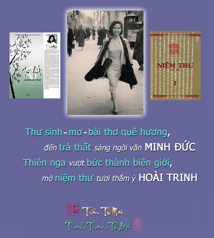 (Bài viết của anh Kiều Phong đã là nguồn cảm hứng khiến cô nghĩa muội của tôi đem cặp câu đối cũ ra trình bày lại. Cũng là lý do khiến cô ấy tìm lại tấm hình cũ và thật đẹp của chị Minh Đức Hoài Trinh hầu giới thiệu với chúng ta. Những chữ “thiên nga vượt bức thành biên giới” vừa muốn ví MĐHT như loài chim thiên nga, vừa nhắc tới thành tích của bà trong việc làm cho Văn Bút Quốc Tế phải công nhận Văn Bút VN tự do, bỏ chế độ CS thoát ra hải ngoại – Trần Huy Bích)