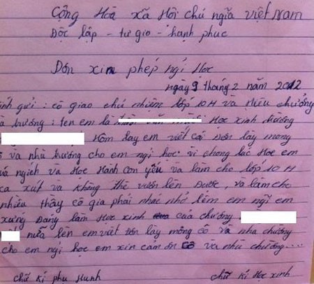 “Người viết đơn là Trần Văn M., học sinh lớp 10. Nguyên văn phần nội dung đơn, M viết: ‘Hôm lay, em viết cái Đơn lày mong cô và nhà trường cho em ngỉ học vì chong lúc Học em quá đùa nghích và Học Hành còn yếu và làm cho lớp 10H xa xút và không thể vươn lên Được, và làm cho nhiều thầy cô gia phải nhác nhở lên em ngĩ em không xứng Đáng làm học sinh của chường…’