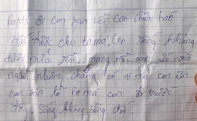 Sáng 13/1, gia đình phát hiện T. tự tử bằng thuốc diệt cỏ, để lại thư tuyệt mệnh để lại với nội dụng: “Ba má ơi, con xin lỗi. Con chưa báo hiếu được cho ba má. Con sống không được nữa rồi. Mang nỗi oan đó vào người nhưng chẳng có ai tin con nên con xin lỗi ba má đi trước đây….”.