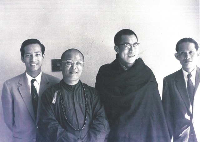 Hình 3: Uống nước nhớ nguồn. Ngay sau cuộc nổi dậy của nhân dân Tây Tạng 1959 bị Bắc Kinh đàn áp đẫm máu khiến Đức Dalai Lama và hơn 100,000 người Tây Tạng phải tỵ nạn sang Ấn Độ. Việt Nam Cộng Hoà lúc ấy đã tức thời gửi lúa gạo sang cứu trợ. Lúa gạo ấy đã được gieo trồng từ nguồn nước con Sông Mekong. Đức Dalai Lama đã tiếp Phái đoàn Việt Nam tại Darjeeling, Ấn Độ. Từ trái: Gs Lê Xuân Khoa Tổng thư ký Hội Văn hoá Á Châu, Thượng toạ Thích Trí Dũng, Đức Dalai Lama, và Phó Chủ tịch Quốc Hội VNCH Cổ Văn Hai. (4)