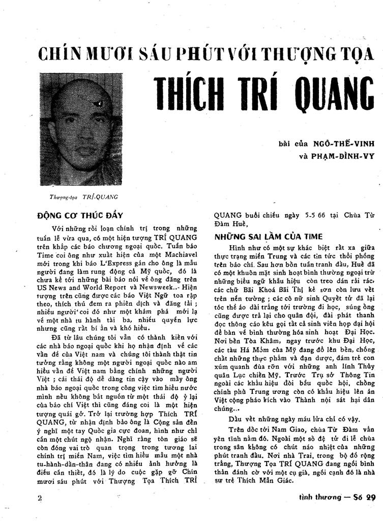 Nguyệt san Tình Thương số 29: 4 trang 2-3-4-5 đăng trọn vẹn cuộc phỏng vấn Thích Trí Quang ngày 05.05.1966 tại Chùa Từ Đàm Huế [nguồn: tư liệu của Trần Hoài Thư, Thư Quán Bản Thảo]
