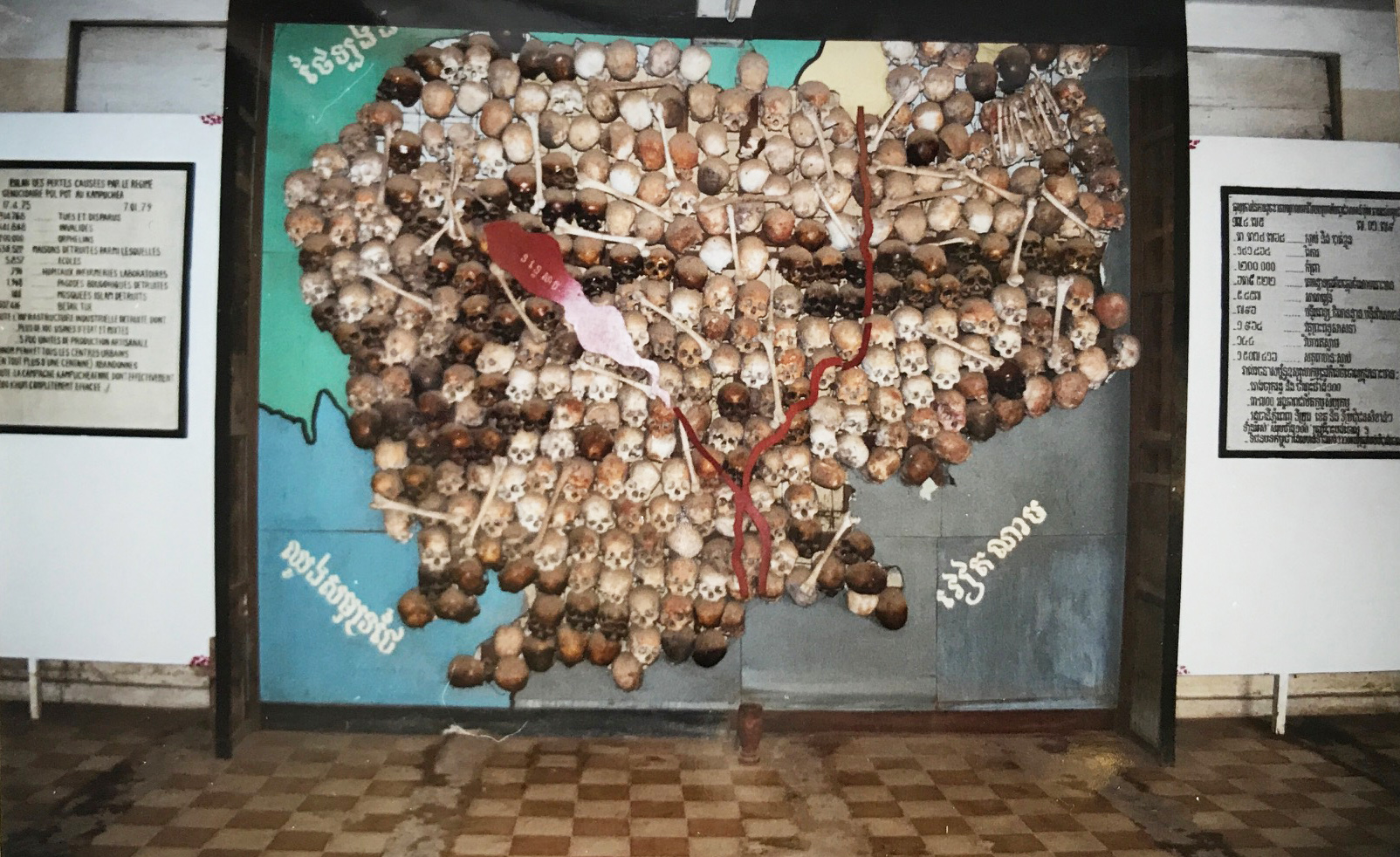 Hình 7: Bản đồ đất nước Cambodia thời kỳ Khmer Đỏ được ghép bằng những sọ người với Biển Hồ và con sông máu Tonle Sap. [photo by Ngô Thế Vinh].