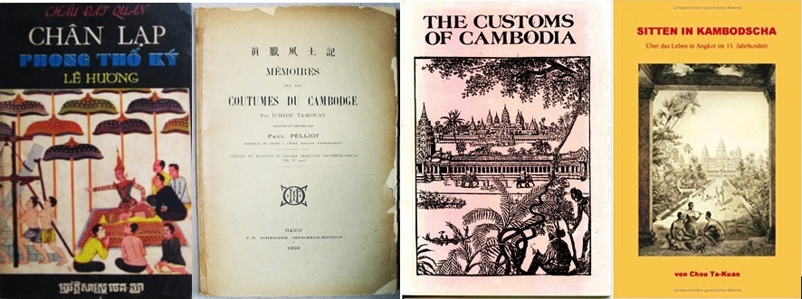 Hình 1, từ trái: Chân Lạp Phong Thổ Ký, bản tiếng Việt của Lê Hương, Saigon 1973; Mémoires sur les Coutumes du Cambodge, bản tiếng Pháp của Paul Pellot, Hà Nội 1902; The Customs of Cambodia, bản tiếng Anh 1993; Sitten in Kambodscha, bản tiếng Đức 1999. [nguồn: internet]