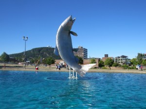 Cá thì chắc chắn không có móng, ngay cả chân cũng không có. Tội nghiệp cho những nàng mỹ nhân ngư, muốn tới nơi hẹn hò với tình nhân chỉ biết lết! Quê hương của tôm hùm có tượng tôm hùm lớm nhất thế giới thì quê hương của cá salmon cũng có tượng cá lớn nhất thế giới. Đó là vùng Campbellton, cũng thuộc tỉnh bang New Brunswick. Tượng chú cá hồi nhảy lên khỏi mặt nước có chiều cao tới 8 thước rưỡi cũng sinh động không kém tượng chú lobster. Khi tôi tới, nhằm buổi trưa, trời nắng trong, những vẩy cá ngậm ánh mặt trời óng ánh. Khung cảnh yên tĩnh lạ thường. Bên kia chiếc hồ có chú cá nhảy lên là một dòng sông xanh trong vắt mang tên Restigouche. Đó là con sông…Gianh! Con sông đẹp hết biết này chia đôi sơn hà giữa tỉnh bang New Brunswick và tỉnh bang Quebec chúng tôi. Chiếc cầu bắc ngang có dáng y hệt như chiếc cầu Jacques Cartier ở thành phố Montreal. Chắc đây là tác phẩm của một ông hay bà kiến trúc sư lười biếng. Băng qua cầu là vùng Pointe-à-la-Croix, cửa ngõ về tỉnh bang nhà của tôi. Nhưng đang đà đi chơi, về chi vội!