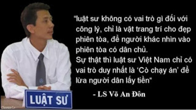 Thấy nhiều người ghi danh dưới bản “Tuyên Bố Phản Đối Việc Xoá Tên L.S Võ An Đôn” nên tôi cũng làm theo (cho nó thêm phần rôm rả) dù không tin rằng đây là điều cần thiết. Tôi cũng không nghĩ rằng chuyện bỏ phiếu để loại bỏ đồng nghiệp (theo chỉ đạo) của mấy ông thuộc Ban Chủ Nhiệm Luật Sư Đoàn Phú Yên là “quyết định tai hại … có thể hủy hoại cả sự nghiệp và đời sống của một con người” – theo như quan niệm của blogger Phạm Lê Vương Các.