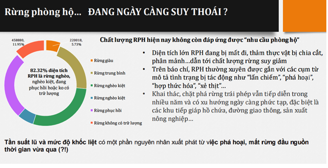 “Rừng phòng hộ ở Việt Nam đang suy giảm mạnh cả về diện tích và chất lượng. Chỉ tính từ 2004-2014, diện tích rừng phòng hộ đã giảm 1,7 triệu hécta, tương đương tốc độ suy giảm trung bình 23%/năm.”