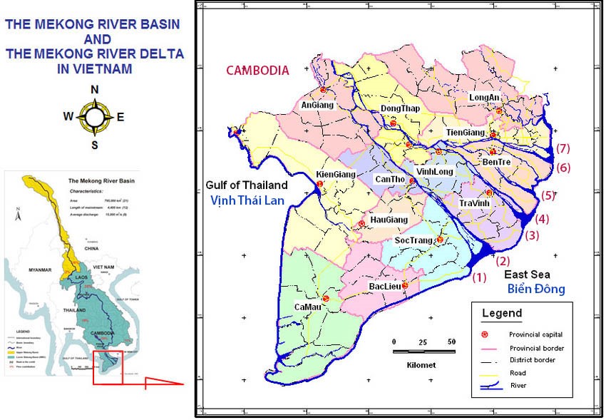 Hình 2: Cửu Long Chín Cửa Hai Dòng, nay chỉ còn Bảy Cửa: Sông Hậu ba cửa nay còn hai: (1) cửa Trần Đề, (2) cửa Định An, (cửa Ba Thắc/ Bassac đã bị lấp). Sông Tiền sáu cửa nay còn năm: (3) cửa Cung Hầu, (4) cửa Cổ Chiên, (5) cửa Hàm Luông, (cửa Ba Lai đã bị đắp đập làm cống từ năm 2000), (6) cửa Đại, (7) cửa Tiểu. [nguồn: CLCD BĐDS p.360].