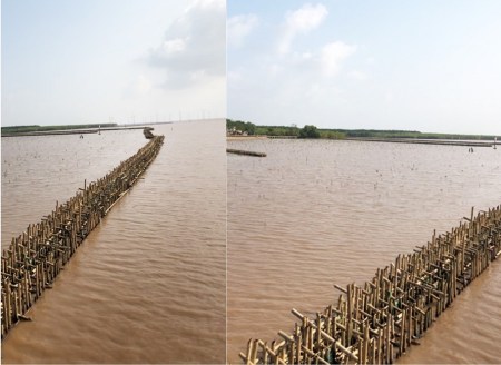 Trên một mặt biển màu nước nâu đẫm phù sa, nhô lên những đọt cây xanh non, được vây quanh bởi những rào tre chắn sóng / wavebreaker để bảo vệ cho những cây non mới trồng. Th.S Nguyễn Hữu Thiện nói, đây là một dự án thử nghiệm của GIZ-Đức [GIZ / Tổ chức Hợp tác Quốc tế Đức] giúp Việt Nam gây lại rừng ngập mặn bảo vệ bờ biển không bị sạt lở. Cũng cần thời gian từ 2-3 năm để các cây non đủ lớn bám rễ và có thể tự chắn sóng.