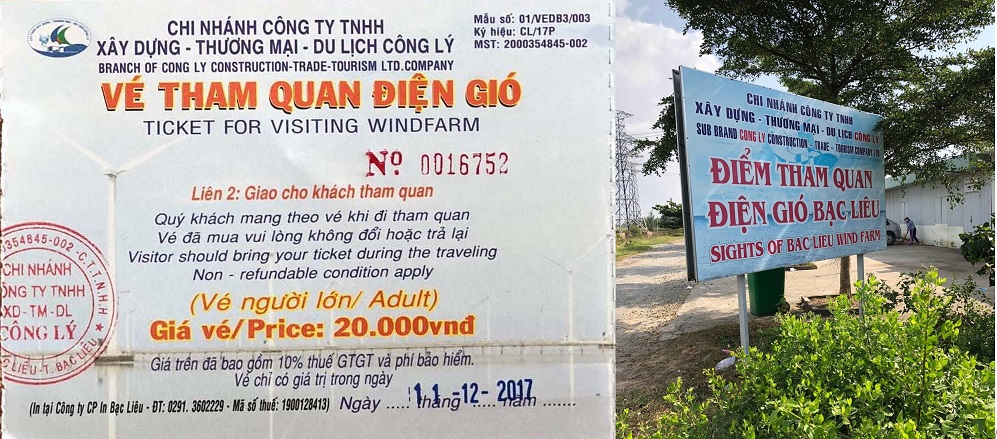Hình 4: Vé vào thăm Khu Điện Gió Bạc Liêu sản xuất nguồn năng lượng sạch, còn được khai thác như một tụ điểm du lịch. [tư liệu Ngô Thế Vinh]
