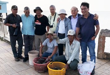 Hình 8: từ trái, TS Lê Phát Quới, BS Nguyễn Văn Hưng, TS Lê Anh Tuấn, KS Phạm Phan Long, TS Dương Văn Ni, Ngô Thế Vinh, ThS Nguyễn Hữu Thiện, cùng với hai người bạn Khmer bán cua biển. Khi Thiện hỏi cua đẻ ở đâu, họ hồn nhiên chỉ cho Thiện chỗ đẻ trên mang bụng con cua cái. [photo by tài xế Sang]