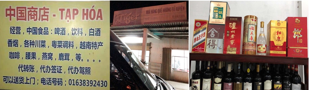Hình 11, trái: Trung Quốc thương điếm, tấm bảng kê những thứ hàng tiệm tạp hóa ấy bán: Trung Quốc thực phẩm, ti tửu (rượu bia), bạch tửu (rượu trắng), hương yên (khói thơm – thuốc lá), Việt Nam đặc sản, già phi (cà phê), yến oa (tổ yến), lộc nhung (sừng hươu non)… Dưới cùng là số điện thoại của tiệm; giữa: Nhà hàng Quê hương Tứ Xuyên; phải: trên kệ với các loại rượu Made in China. [photo by Ngô Thế Vinh]