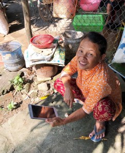 Hình 6: bà Ngoại ngồi chồm hổm với chiếc iPad nói chuyện với đứa cháu ngoại mãi tận bên Hàn quốc, bà có một đứa con gái lấy chồng Đại Hàn, nó vẫn gửi tiền về cho mẹ và cả chiếc iPad để cho Ngoại nói chuyện với cháu cho đỡ nhớ. [photo by Ngô Thế Vinh]