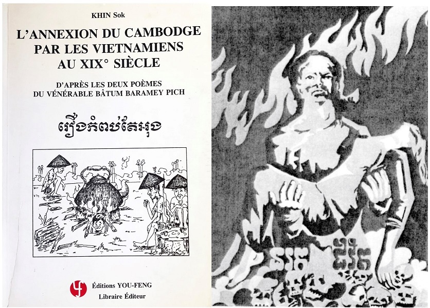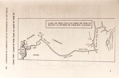 Hình 15: trái, (a) Cuốn sách tiếng Pháp có tựa đề “Sự sát nhập nước Cambodge bởi người Việt vào Thế kỷ XIX” với hình bìa là ký hoạ cảnh “Vị Quan Triều Nguyễn chôn sống ba người Khmer ngập tới cổ rồi dùng đầu họ làm kiềng ba chân đặt nồi nấu cơm”; (b) phải, “Điều tệ hại nhất đã qua rồi”, “Chúng ta phải giết bọn Yuon – tức người Việt” đó là những khẩu hiệu chống Việt Nam thời Lol Nol; (c) sơ đồ Canal de Prêk Yuan, tên Khmer của con kênh Vĩnh Tế, với ghi chú tiếng Pháp: Canal de Prêk Yuan ou Canal de Vinh Te Reliant la Rivière de Chau Đoc à Hà Tien, trang 394 sách đã dẫn [tư liệu Ngô Thế Vinh]
