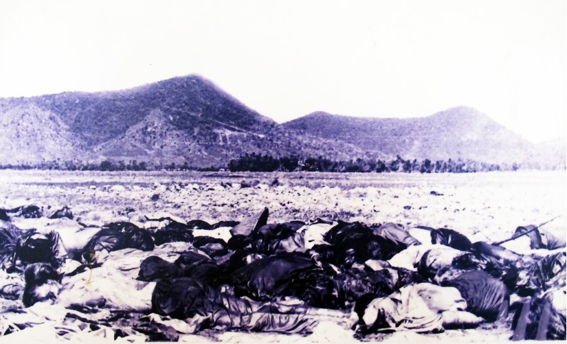 Hình 16: trên, Cánh Đồng Chết vùng quanh Núi Tượng và Núi Dài thị trấn Ba Chúc huyện Tri Tôn tỉnh An Giang tháng 4 năm 1978; dưới: nhà Mồ Ba Chúc tưởng niệm 3,157 thường dân bị Khmer Đỏ sát hại. [nguồn: báo Kiến Thức & Wikipedia tiếng Việt]