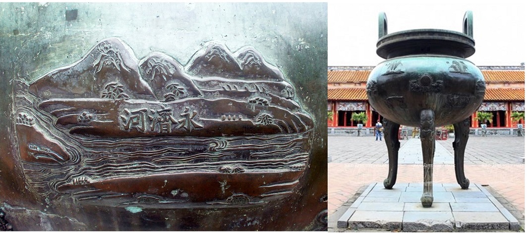 Hình 14: Kênh Vĩnh Tế là con sông đào lịch sử dài hơn 90 km chảy thẳng từ Châu Đốc xuống Hà Tiên, là một công trình đồ sộ gắn liền với tên tuổi Thoại Ngọc Hầu. Công trình khai phá bất hủ ấy được vua Minh Mạng cho khắc hình trạm trên Cao Đỉnh với dòng chữ Vĩnh Tế hà / 永濟河 / Sông Vĩnh Tế. Cao Đỉnh là chiếc đỉnh đầu tiên, thờ vua Gia Long, Thế tổ Cao Hoàng đế, là một trong 9 chiếc Đỉnh / Cửu Đỉnh được vua Minh Mạng ra lệnh đúc năm 1835 hoàn thành 1837, đặt trước sân Thế miếu, và nay vẫn còn nguyên vẹn trong Hoàng thành Huế. [nguồn: Báo Ảnh VN, photo by Trần Thanh Giang]