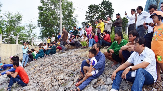 Hình 13: Đúng 8 giờ sáng ngày 22.09,2017 đập tràn Tha La bắt đầu xả lũ, một giờ sau cùng ngày con đập tràn Trà Sư cũng xả lũ. Dân chúng không dấu được nỗi hân hoan khi thấy nước lũ cuồn cuộn chảy về hạ lưu mang theo bao nhiêu phù sa và cá vào trong ruộng đồng. [nguồn: Tuổi Trẻ Online 22.09.2017]
